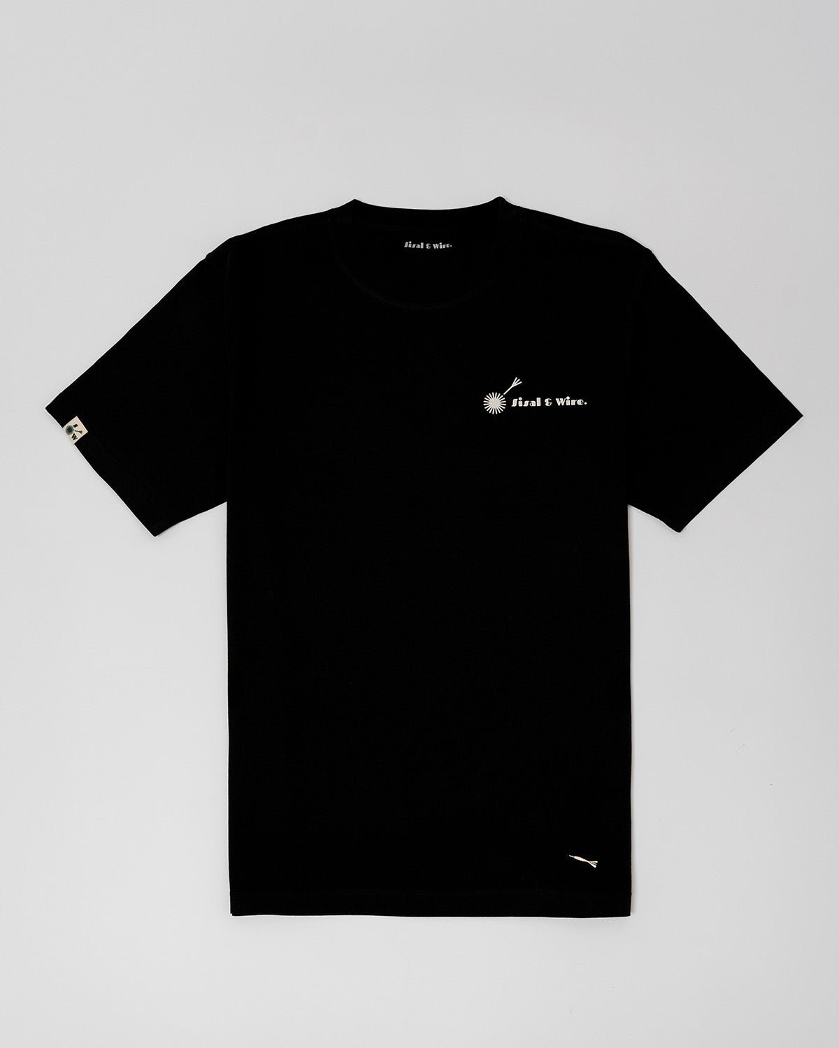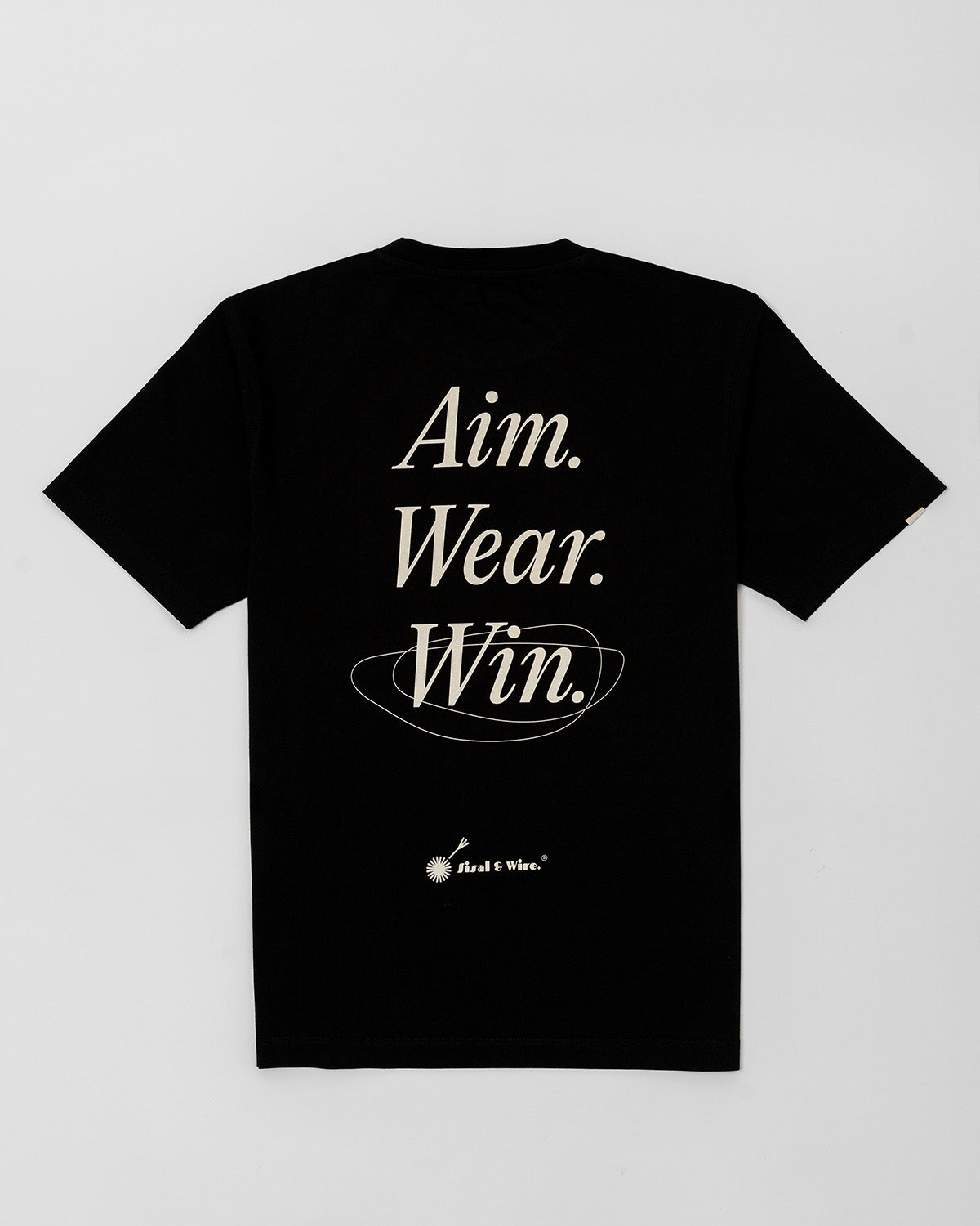 The Slogan Tee launches the first drop with a bold full-back print in crisp sisal white, standing out perfectly against the black cotton base.